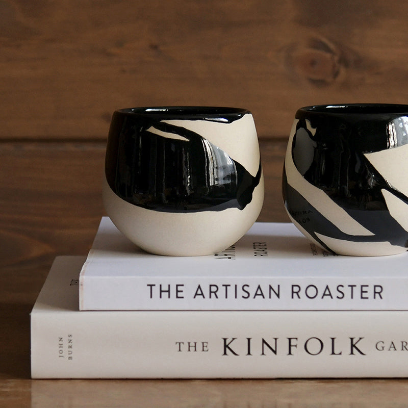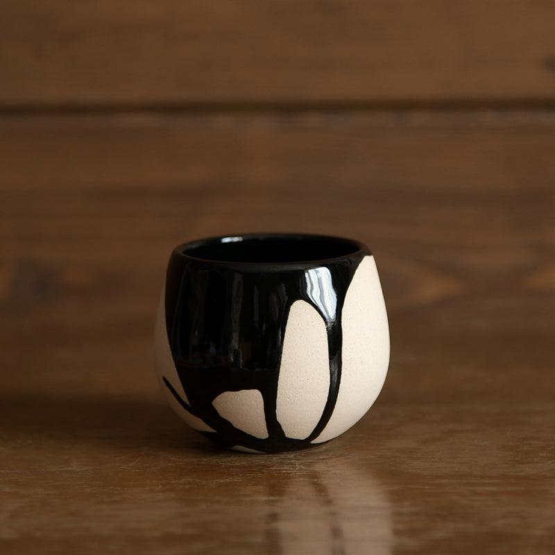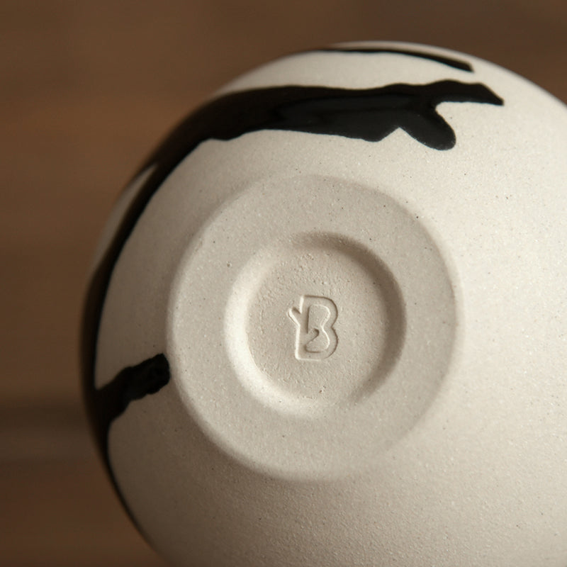 // GLOSSY BLACK GLAZE DRIP OVER IVORY CLAY BOTTOM //