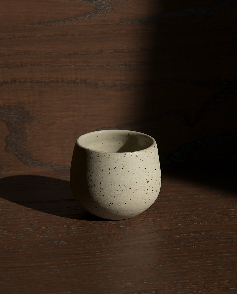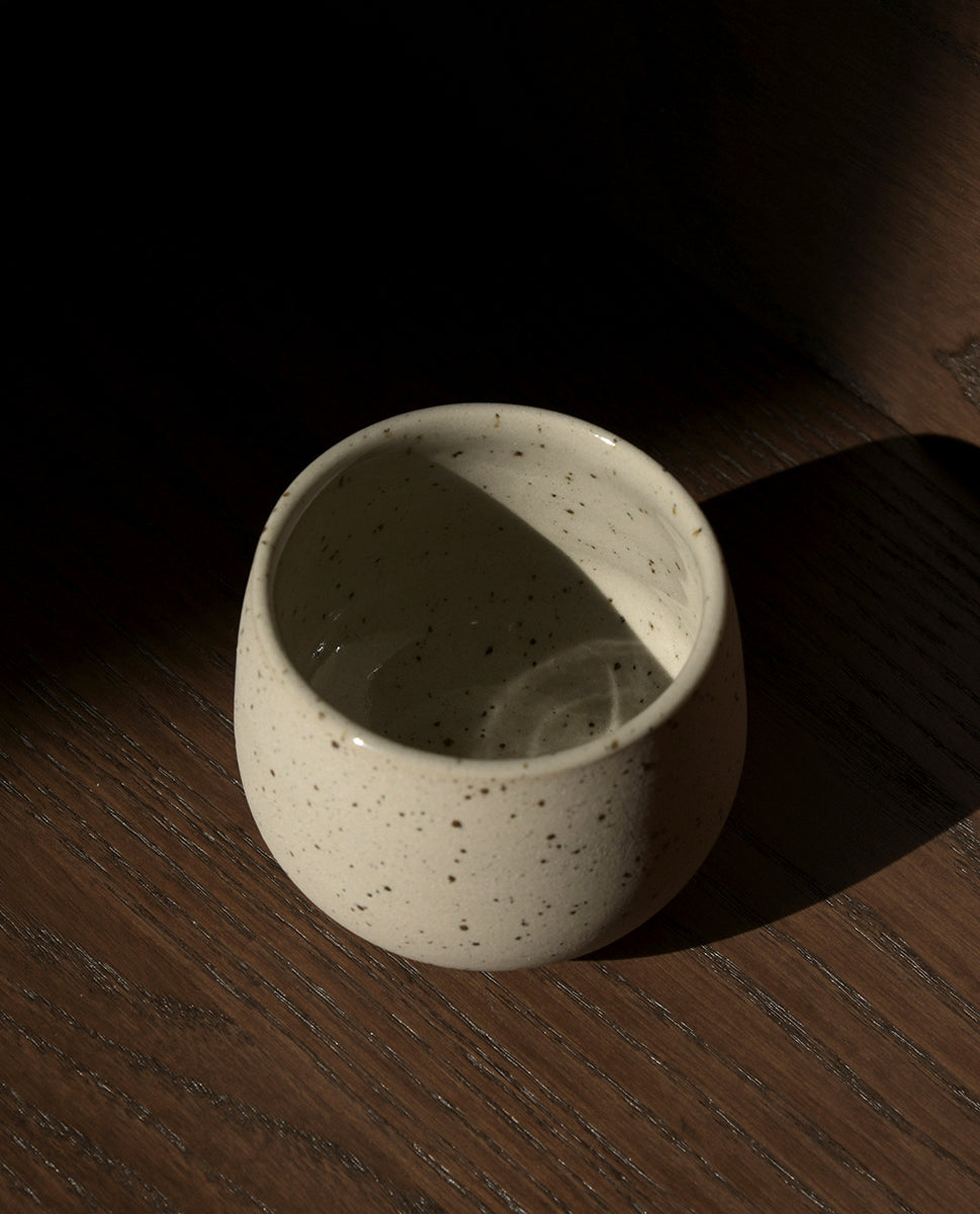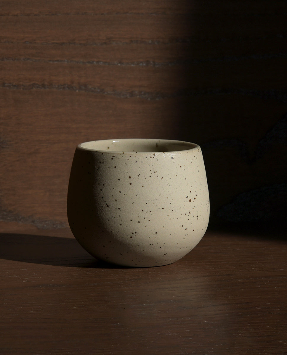 Handcrafted on the pottery wheel from speckled beige stoneware clay, glazed inside in a glossy transparent glaze, high fired above 1200 °C to get a beautiful stonelike finish. The egg-shaped cup is comfortable to hold and fits perfectly in hand.