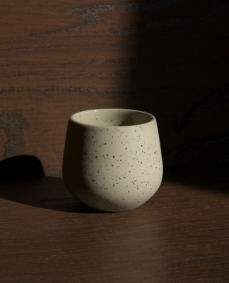 Handcrafted on the pottery wheel from speckled beige stoneware clay, glazed inside in a glossy transparent glaze, high fired above 1200 °C to get a beautiful stonelike finish. The egg-shaped cup is comfortable to hold and fits perfectly in hand.